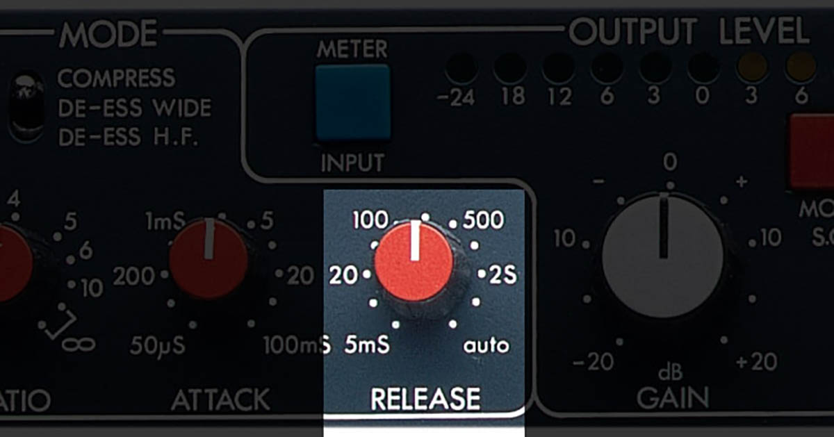 The release control sets the time the compressor takes to react to a signal level that is falling. So suppose the signal level is above the threshold and the compressor works to bring it down in level. Then it falls below the threshold and the compressor returns to its 1:1 uncompressed state. There will be a certain reaction time for this change to happen, and that is set by the release control.