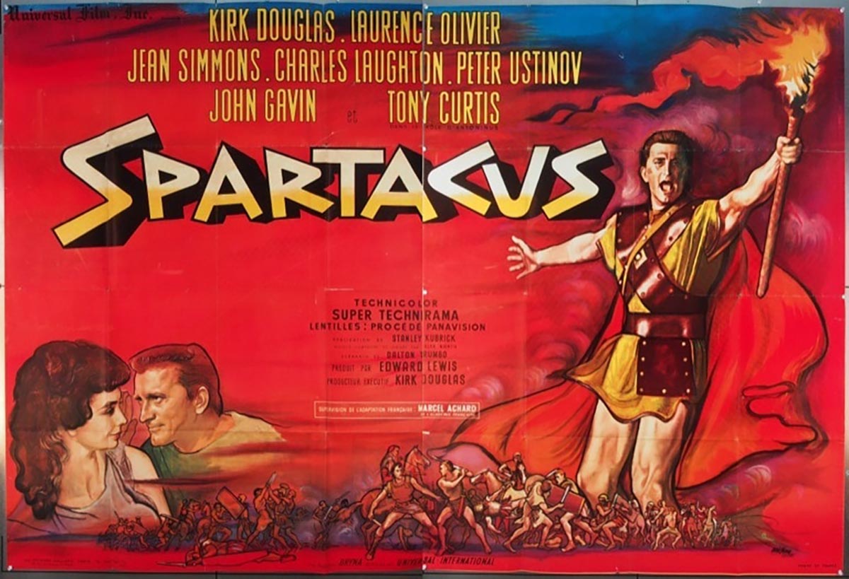 The movie is Spartacus, from 1960. It's big in every way possible including its stars such as Kirk Douglas, Laurence Olivier, Charles Laughton, Jean Simmons, Peter Ustinov and Tony Curtis, also including its duration at over three hours, and its film format Super 70 Technirama, which uses 35 mm film like ordinary movie cameras, but sideways so that the image can be significantly larger.