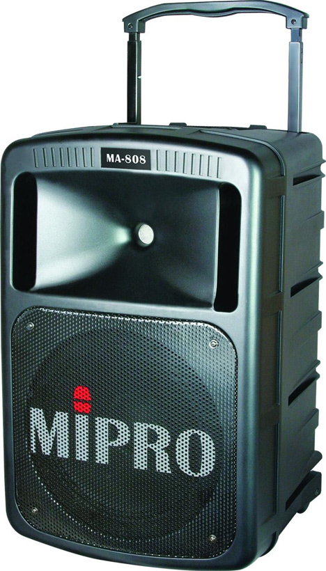 Avlex Corporation is pleased to announce the introduction of the new MiPro MA-808 Portable Wireless PA System. Featuring a rugged, high-impact enclosure with retractable handles and integrated wheels for easy transport, this bi-amplified system delivers clear, powerful sound—thanks to a Class AB amplifier for the HF (high frequency) driver and a Class D amplifier that drives a large, 10-inch woofer. With a built-in MP3 recorder/player module, support for two wireless receiver modules, and storage provisions for the transmitters, the MA-808 is a complete, self-contained PA solution.