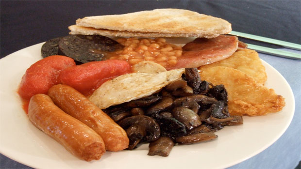 Mmmmm... eggs, bacon, sausages, tomatoes, bread and maybe some black pudding, all sizzling away in a pool of molten lard in a much-used and deeply patinated frying pan.